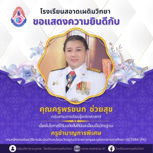 ขอแสดงความยินดีกับ คุณครูนิลวรรณ นิลยกานนท์ ข้าราชการครูโรงเรียนสอาดเผดิมวิทยา เนื่องในโอกาสได้รับแต่งตั้งให้มีและเลื่อนวิทยฐานะ ชำนาญการพิเศษ