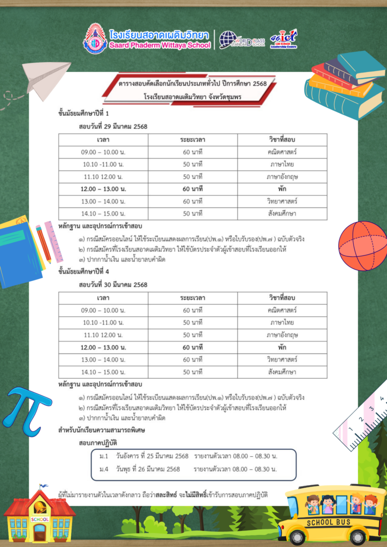 ตารางสอบคัดเลือกนักเรียนประเภททั่วไป ปีการศึกษา 2568