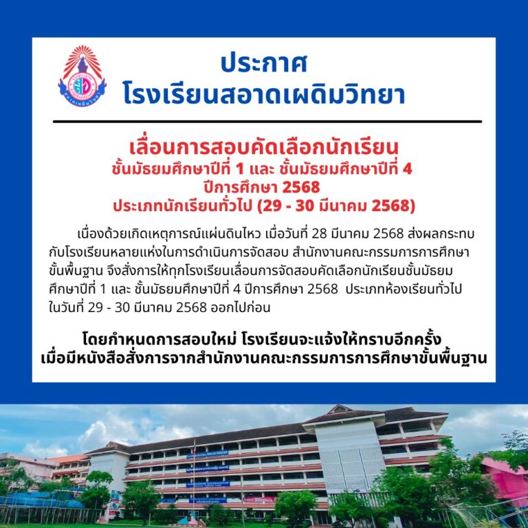 รับสมัครนักเรียน ปีการศึกษา 2568เลื่อนการสอบคัดเลือกนักเรียน ม.1 และ ม.4 ปีการศึกษา 2568 ประเภทนักเรียนทั่วไป28 มีนาคม 2025