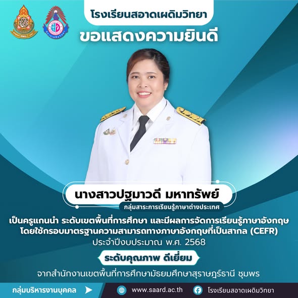 ข่าวสำหรับครู และบุคลากรข่าวแสดงความยินดีขอแสดงความยินดีกับ นางสาวปฐมาวดี มหาทรัพย์ ครูแกนนำ ระดับเขตพื้นที่การศึกษา และมีผลการจัดการเรียนรู้ภาษาอังกฤษ โดยใช้กรอบมาตรฐานความสามารถทางภาษาอังกฤษที่เป็นสากล (Common European Framework of Reference for Languages : CEFR)10 พฤศจิกายน 2025
