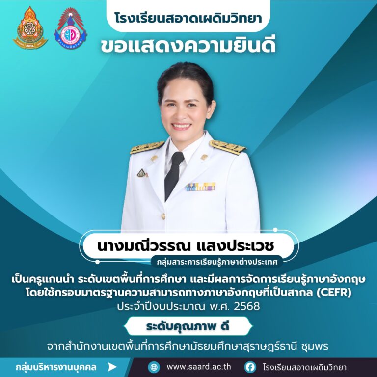 ข่าวสำหรับครู และบุคลากรข่าวแสดงความยินดีขอแสดงความยินดีกับ นางมณีวรรณ แสงประเวช ครูแกนนำ ระดับเขตพื้นที่การศึกษา และมีผลการจัดการเรียนรู้ภาษาอังกฤษ โดยใช้กรอบมาตรฐานความสามารถทางภาษาอังกฤษที่เป็นสากล (Common European Framework of Reference for Languages : CEFR)10 พฤศจิกายน 2025