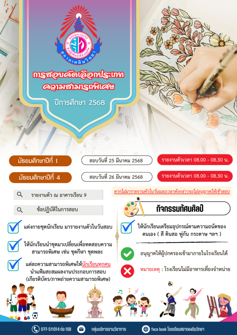 รับสมัครนักเรียน ปีการศึกษา 2568รายชื่อผู้มีสิทธิ์สอบประเภทความสามารถพิเศษ ชั้นมัธยมศึกษาปีที่ 4 ปีการศึกษา 256823 มีนาคม 2025