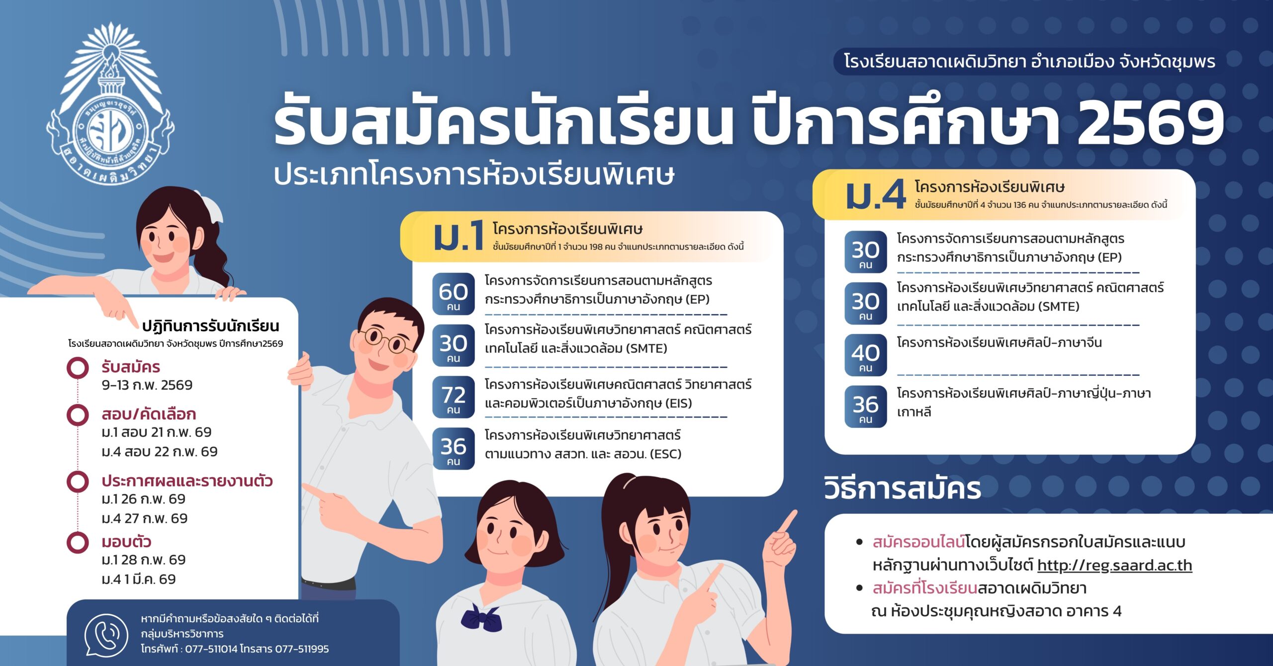 การรับสมัครนักเรียนชั้นมัธยมศึกษาปีที่ 1 และชั้นมัธยมศึกษาปีที่ 4 ปีการศึกษา 2568 ประเภทโครงการห้องเรียนพิเศษ ข่าวรับนักเรียน ปีการศึกษา 2568 การรับสมัครนักเรียนชั้นมัธยมศึกษาปีที่ 1 และชั้นมัธยมศึกษาปีที่ 4 ปีการศึกษา 2569 27 มกราคม 2026 ข่าวประชาสัมพันธ์,รับสมัครนักเรียน ปีการศึกษา 2569