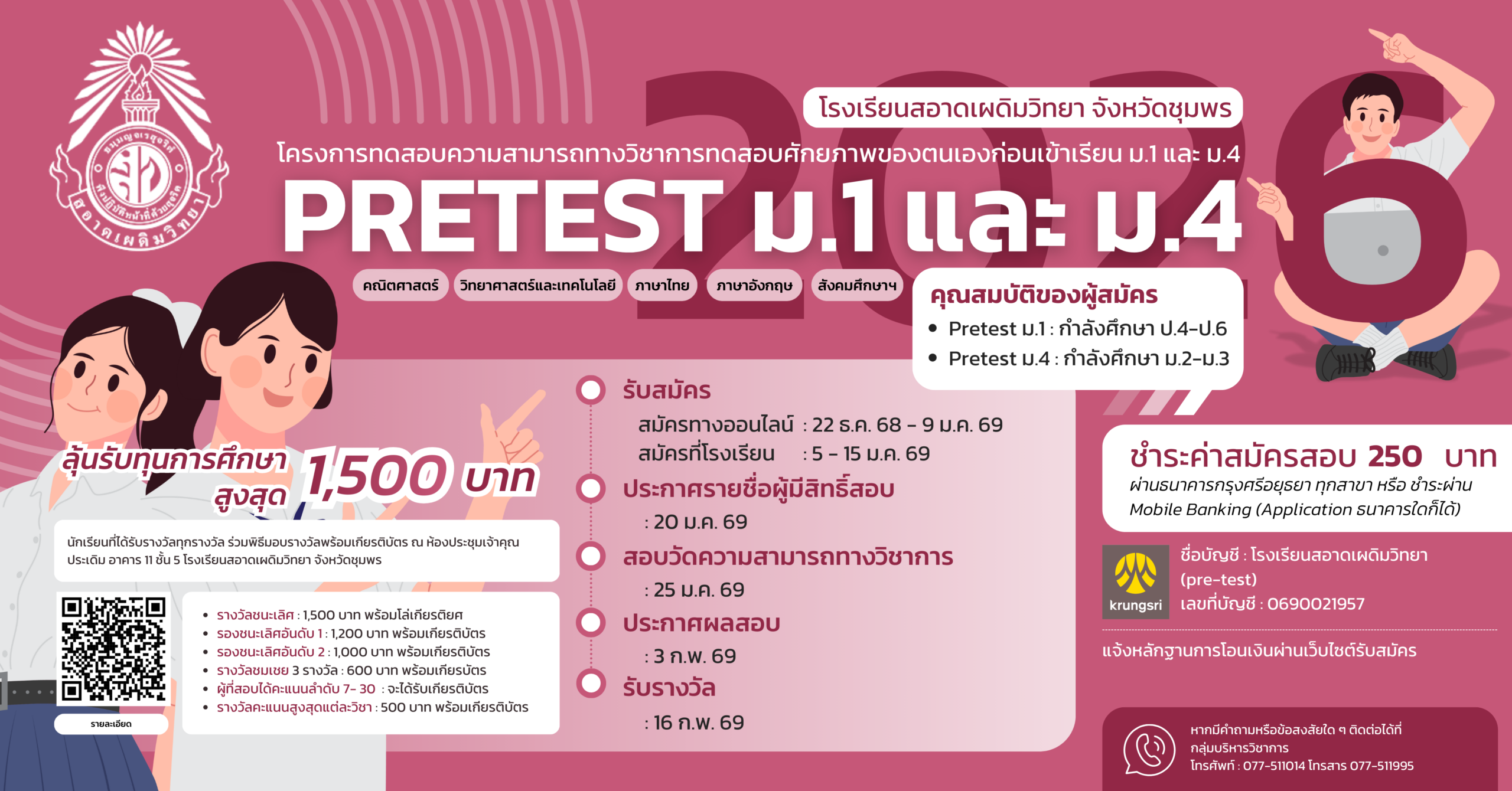 • ยื่นความจำนงในระหว่างวันที่ 5-15 มกราคม 2569  ณ ห้องกลุ่มบริหารวิชาการ อาคาร 1 ชั้น 1 โรงเรียนสอาดเผดิมวิทยา จังหวัดชุมพร ค่าดำเนินการสอบคนละ 250 บาท